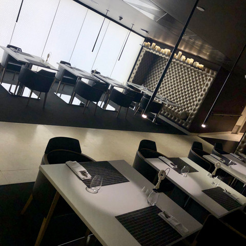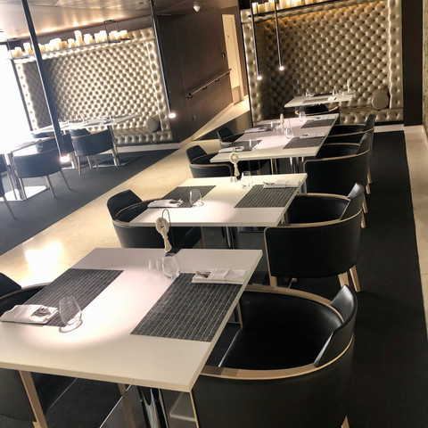 I poked my head into the formal dining area to snap some pictures but I didn't eat anything as I'd just stuffed my face by the bar and didn't want to be a complete pig as I would also be eating en route to Doha. However, this area was very chic and well appointed with a dark and silver colour scheme. If I'd had longer and/or been travelling with someone, this would have been an ideal space to enjoy some fine a la carte dining. It was also very quiet, with only one person eating here.